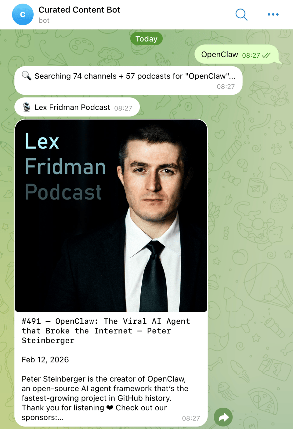 Submit a topic to the bot — and it semantically (!) searches all your YouTube and podcast subscriptions in seconds.