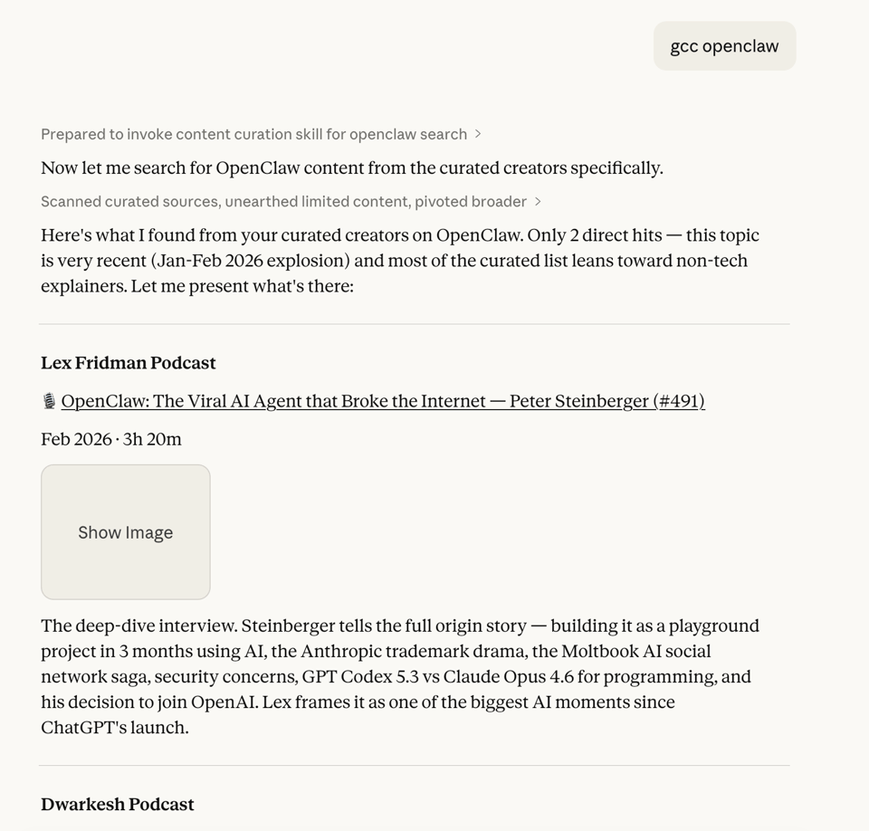 So here’s what I have in mind. I tell a bot or an agent what I’m interested in, and it suggests content from a curated list of creators.